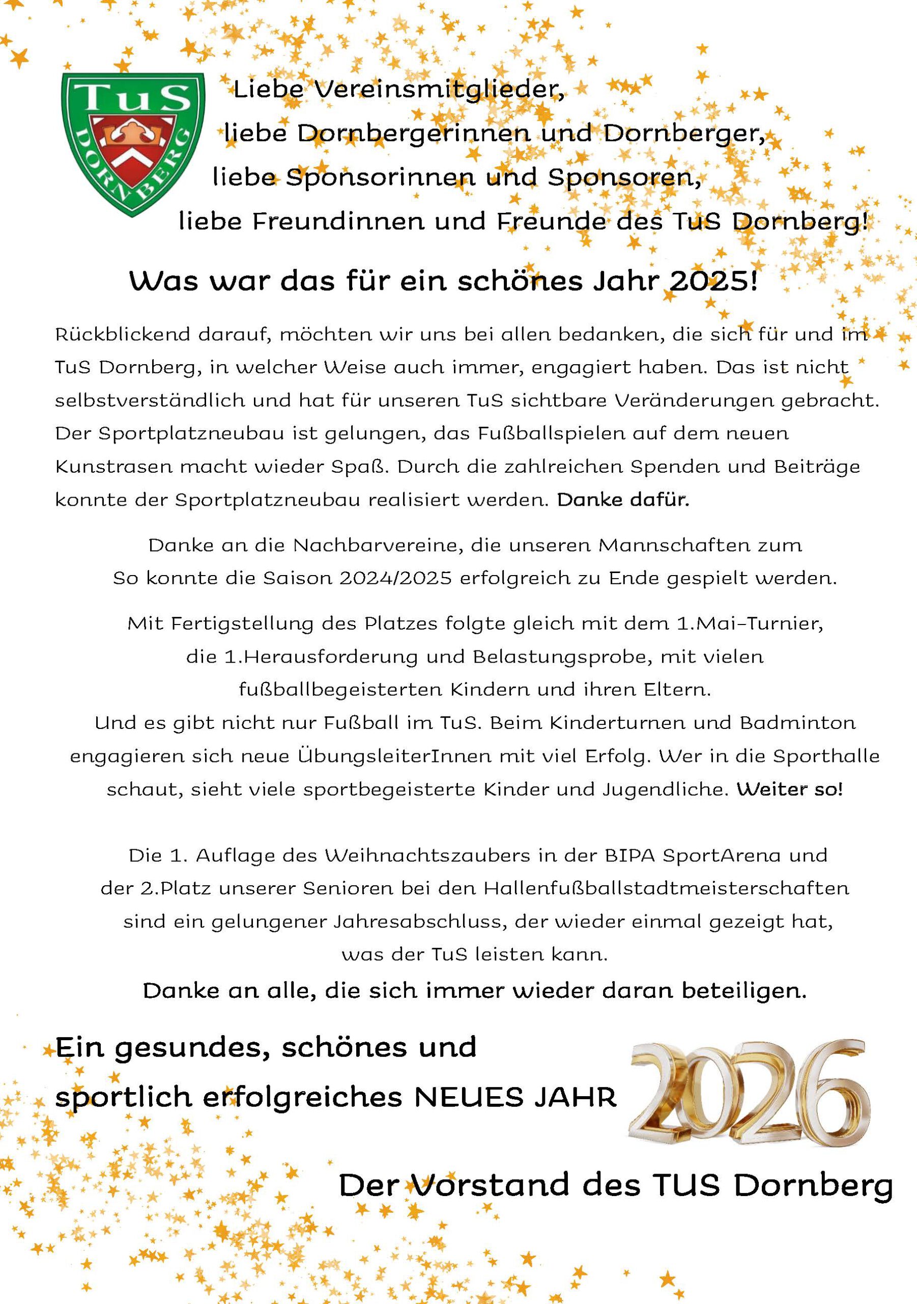 Ein schönes NEUES JAHR 2026 Beitrags-Autor:Annette Beitrag veröffentlicht:31. Dezember 2025 Beitrags-Kategorie:Uncategorized Das könnte dir auch gefallen Neujahrsgruß 31. Dezember 2024 Wanderung zum Trainingsauftakt 2. Juli 2023 Heute ist Jahreshauptversammlung: Schwerpunkt Sportplatzumbau 18. April 2024